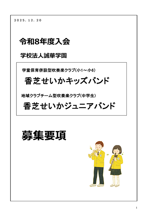 『香芝せいかキッズバンド』及び『香芝せいかジュニアバンド』は学校区に縛られることなく、音楽が好きな子どもたちが集まれる地域のクラブです。地域の小・中学生が集い、交流しながら高みを目指し活動していく中で、楽器の技術や音楽性だけでなく、社会性やバランスのとれた人間力もはぐくまれていくと考えています。